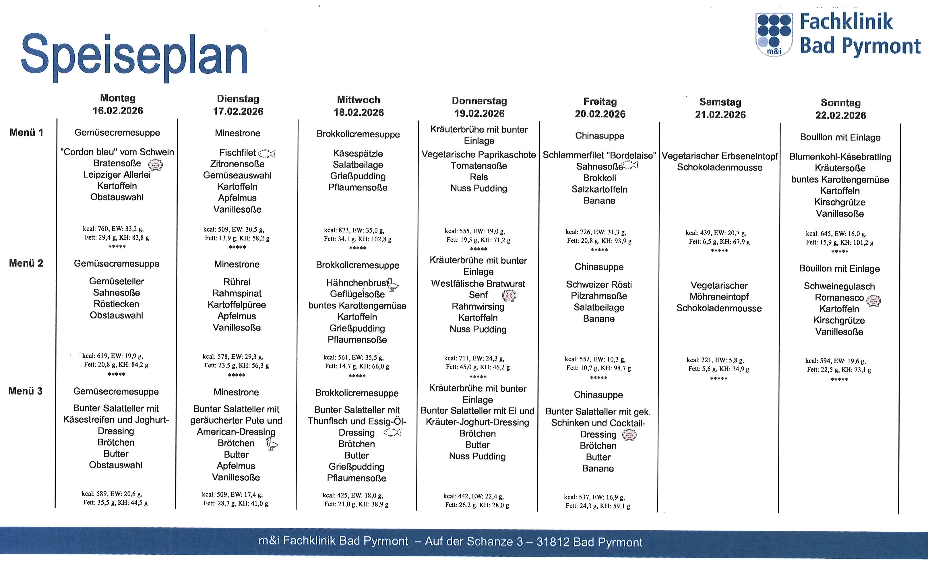 Sie haben täglich die Auswahl zwischen drei Menüs, wobei eines davon vegetarisch ist (Änderungen vorbehalten)